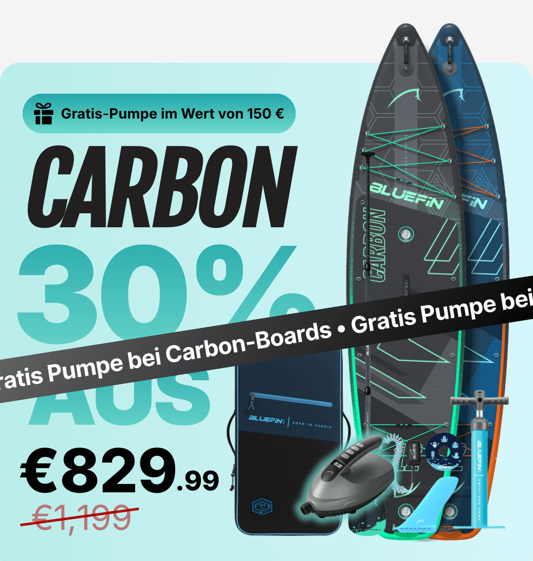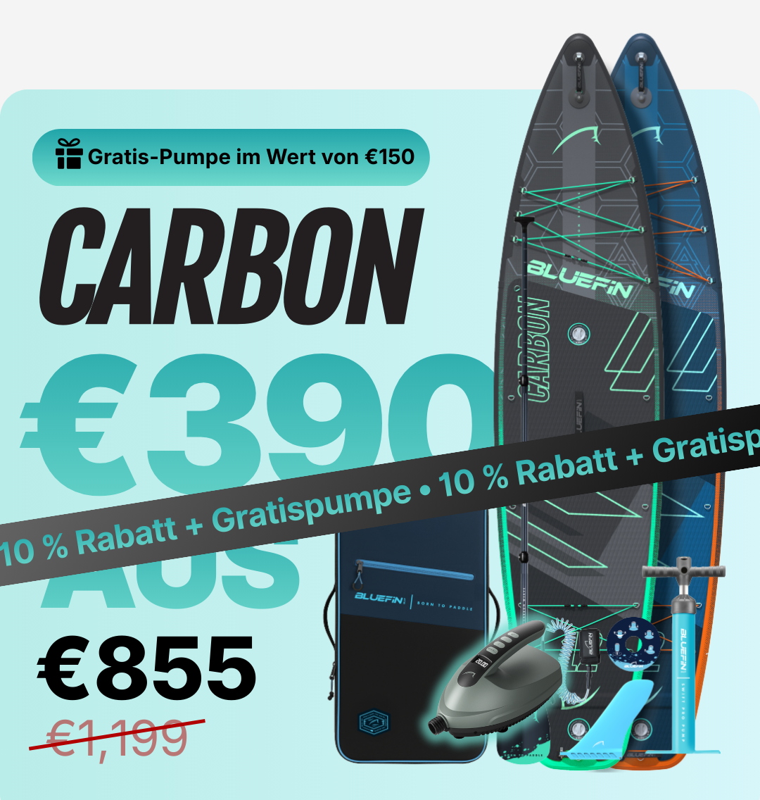 Inflatable Bluefin SUP paddleboard with textured deck, center fin, paddle, pump, and carrying bag.