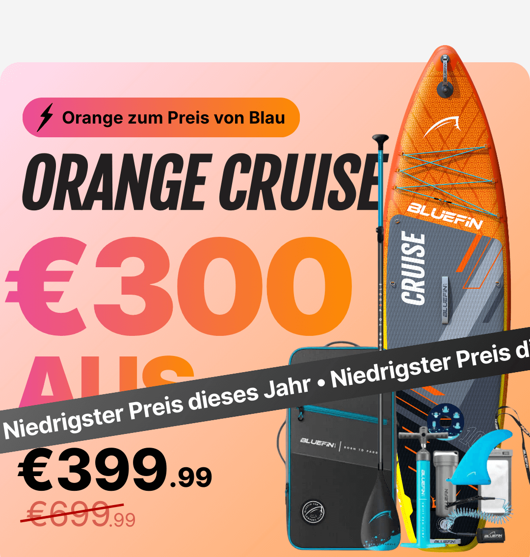 Inflatable paddleboard with orange and gray design, paddle, pump, fin, and carrying bag included.